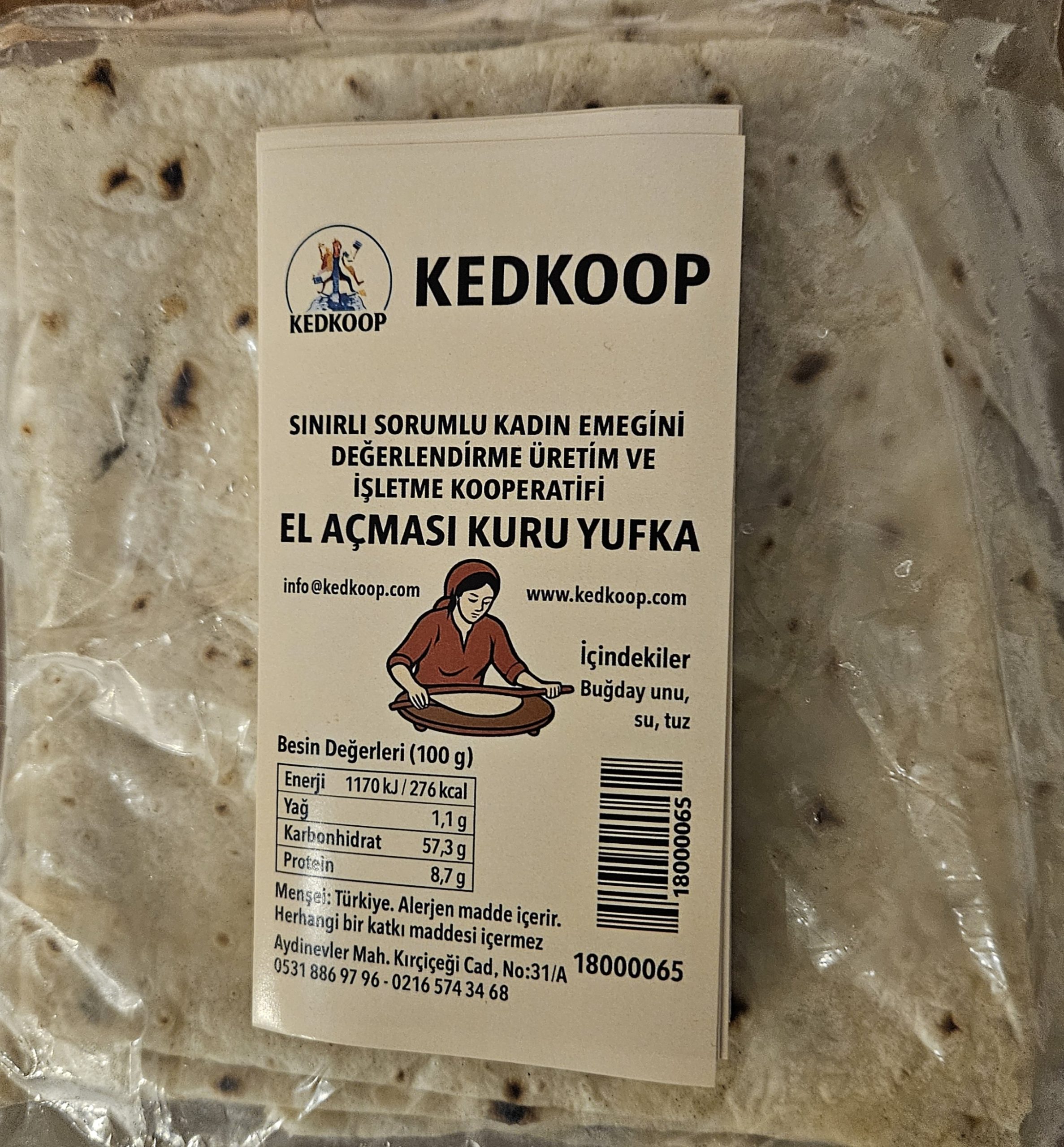 El açması 50×50 ebatlarında olup içinde 5 adet kuru yufka bulunmaktadır.Az ıslatılarak katlanıp paketlenmektedir.Derin Dondurucuda muhafaza edilirse raf ömrü uzundur mikrodalgada ısıtıldığında ilk günkü tazeliğini korur.İçinde un,su ve tuz bulunmaktadır.